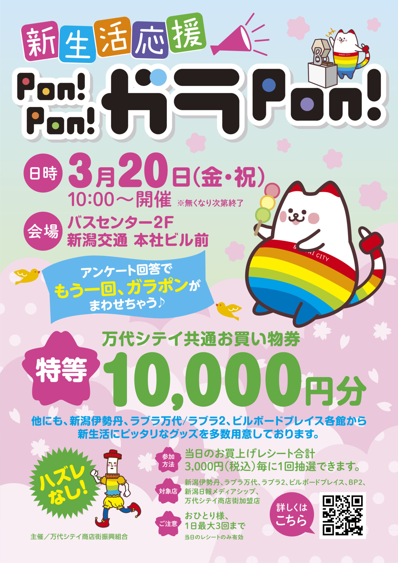 万代シテイ商店街加盟店でのお買上げレシート3,000円(税込)ごとに1回抽選に参加することができるので、お買い物ついでにぜひお立ち寄りください!
