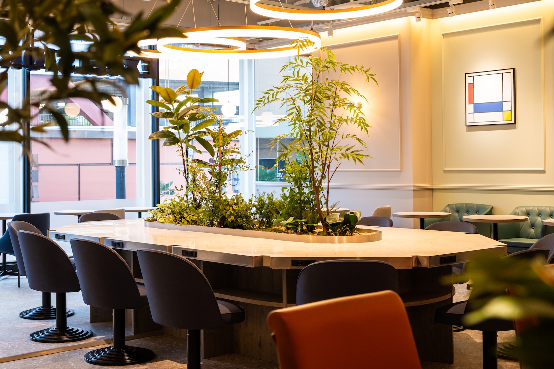 コンセント、Type-CのUSBポート付きで、勉強や仕事をしたい人にぴったり。机から視線を上げると中央の植物が目に飛び込んできて、ふっとリラックスできます。