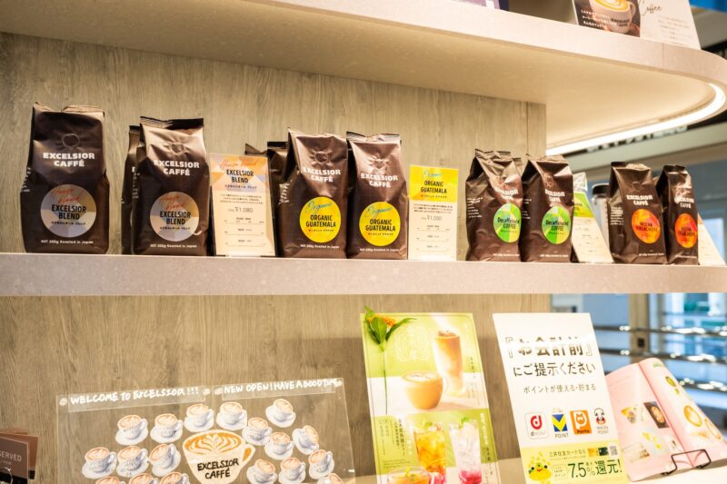 カフェラテにも使われている『エクセルシオール ブレンド』のほか、物販のみで提供されている『オーガニックグアテマラ』『カフェインレスコーヒー』『エチオピア モカ イルガチェフェ』が揃います。